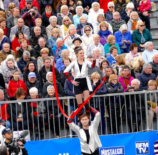 Autrefois la bataille des fleurs se déroulait sur la Promenade des anglais mais depuis les attentats de 2016, les chars tournent désormais autour de la Place Masséna. Le moins que l'on puisse dire c'est que la sécurité était au rendez-vous ! Des contrôles d'entrée dignes d'un grand aéroport, des agents de sécurité partout. Du coup une fois les portiques passés, place à fête !